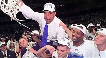 The 1997-98 Kentucky Wildcats clawed their way back to a third straight title game, winning the NCAA National Championship over Utah 78-69. The road wasn't easy, however, with dramatic second-half comebacks against Duke and Stanford just to get to the final game (not to mention weathering the SI cover jinx and having Tim Higgins referee one of their games). Kentucky played through much adversity, including starting the season off with new coach Orlando "Tubby" Smith who replaced Rick Pitino. His inaugural season was an unqualified success as he posted a 35-4 record.