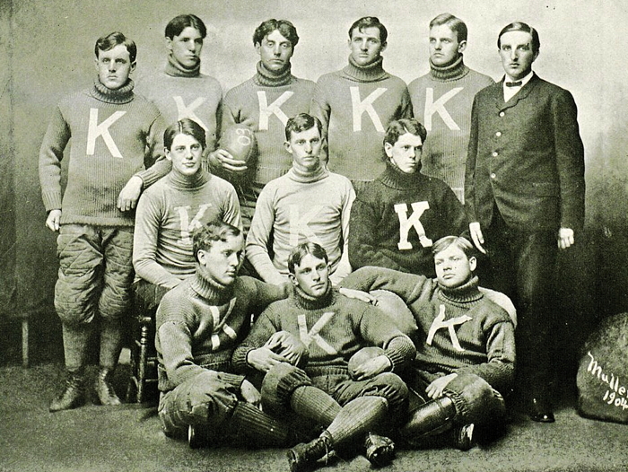 Prolonged cheering filled the air. With pennants and ribbons waving, the victorious team of K.U., not a man injured, was carried from the field on the shoulders of its enthusiastic supporters. Across the field and up the benches ran a K.U. man to where a girl was waiting for him.