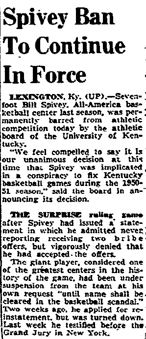 After the testimony, Spivey returned to Kentucky feeling that he had vindicated himself and expressed hope that he could be reinstated in time for the NCAA tournament. [For his part, Coach Rupp when asked about the prospect of Spivey returning to the team stated that "We organized our team this year to take care of the loss of Spivey. We have a winning combination which I would not care to disrupt by a sudden change." (Lima (OH) News, March 3, 1952). In retrospect, Kentucky could have used Spivey when they got beat by St. John's in the NCAA tournament that year. The Redmen's Bob Zawoluk, a All-American center who Spivey had contained in previous games, exploded for 32 points in the victory.]