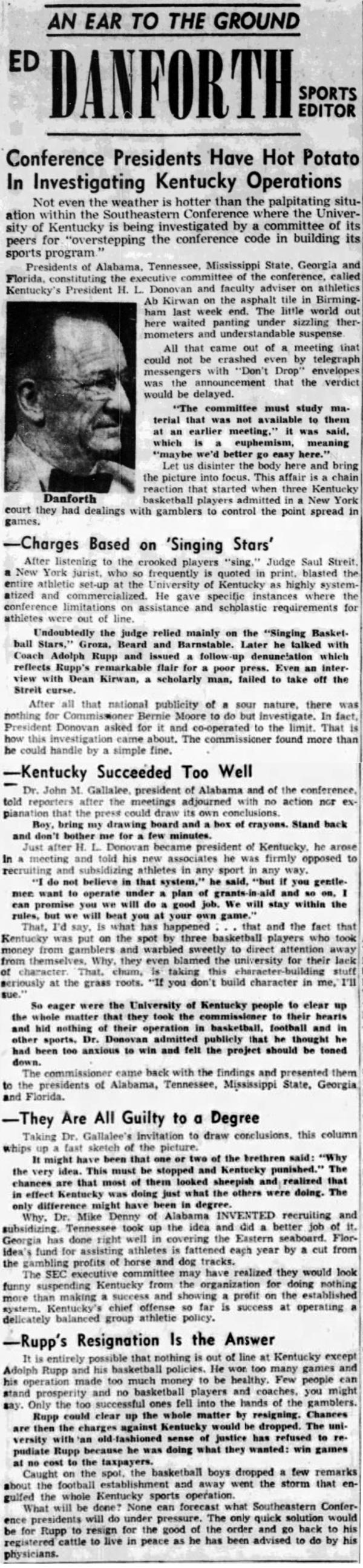 The investigation dragged on through the summer of 1952. In late July, legendary Atlanta Journal sports columnist Ed Danforth in his column suggested that Adolph Rupp stepping down would solve the issue, as the charges could be dropped and the SEC members wouldn't have to worry about setting a precedent which they themselves could easily fall victim to.