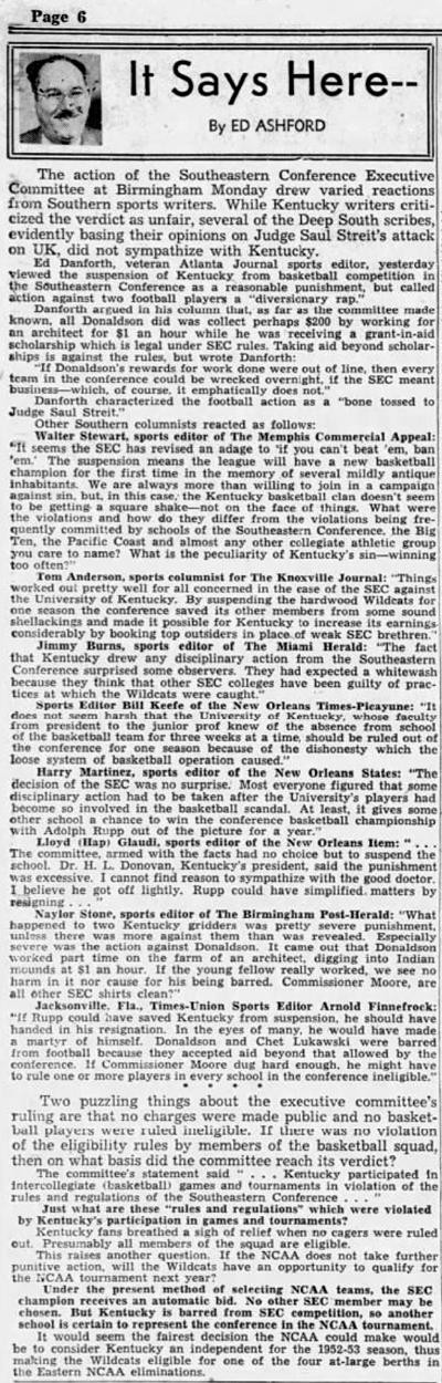 The decision by the SEC was met with varied reaction in the Commonwealth and the South. "If you can't beat'em, suspend 'em." wrote Lexington Herald sports editor Ed Ashford to sum up how he thought the SEC's proceedings went. While some sportswriters thought Kentucky got what they deserved, many acknowledged that the charges against Kentucky could have applied to any other SEC school, the very ones sitting in judgement.