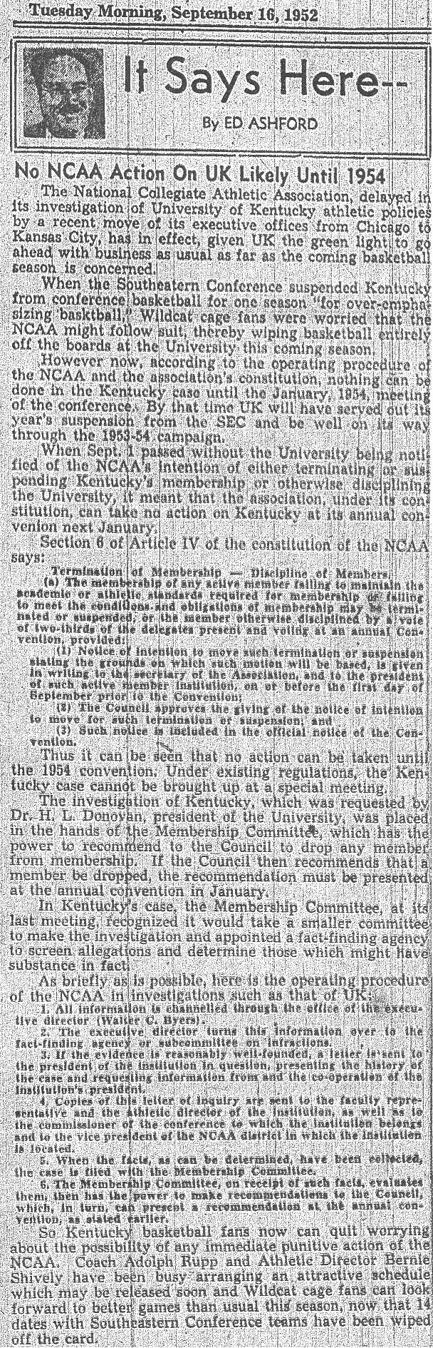 The penalty: Probation for a year. But Michigan State can play schedules in all sports and will be eligible for Big Ten and NCAA championships! Figure it out yourself, I can't." - by Ed Ashford, Lexington Herald, February 23, 1953.