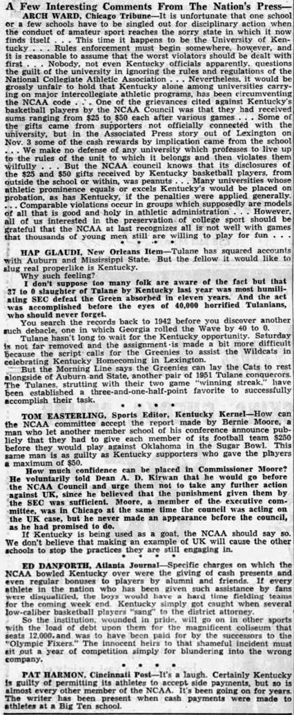 Wrote Arch Ward of the Chicago Tribune, "We make no defense of any university which professes to live up to the rules of the unit to which it belongs and then violates them willfully . . . But the NCAA council knows that its disclosures of the $25 and $50 gifts received by Kentucky basketball players, from outside the school or within, was peanuts. . . Many universities whose athletic prominence equals or excels Kentucky's would be placed on probation, as has Kentucky, if penalties were applied generally. . .Comparable violations occur in groups which supposedly are models of all that is good and holy in athletic administration . ."