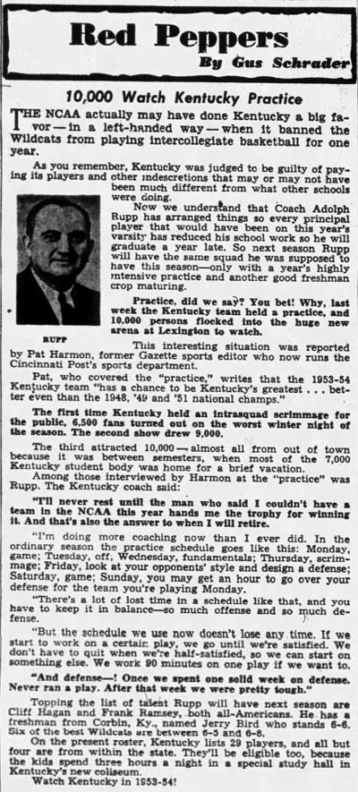 "They'll be no point shaving this year," said Rupp. "When we run up one of those 95 or 97-point totals - and we used to do it often - and there's still a couple of minutes to play, I'm not going to pull my boys up and have them stand around at midcourt and try to hold the score down so we don't humiliate somebody. We'll just keep playing our game and let the other guy worry." (by Jimmy Breslin (NEA), December 14, 1953).
