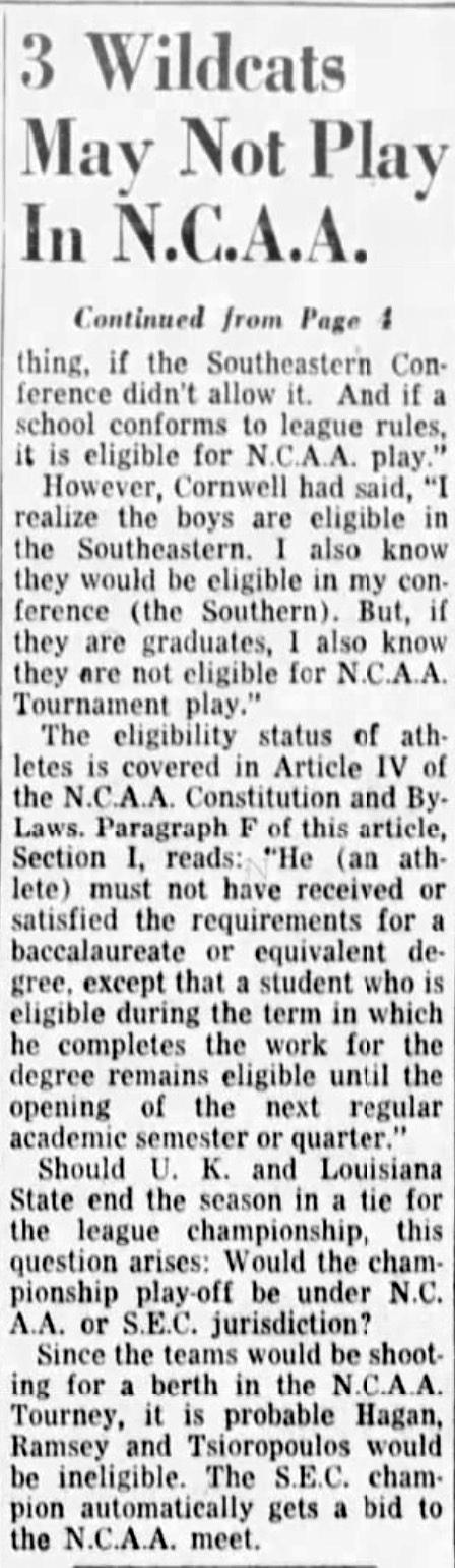 The other lingering point of contention dealt with the eligibility of UK's three returning seniors (Cliff Hagan, Frank Ramsey and Lou Tsioropoulos), who formed the core of their squad. Since the three either had already graduated (or were due to graduate before the spring semester) and were finishing their basketball eligibility as graduate students, they were technically not able to compete in the NCAA tournament according to a rule on the books at the time (although they were still eligible to compete in the regular season).