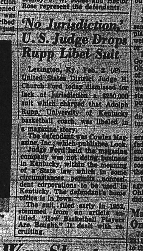 In fact, Rupp did demand a retraction from Look Magazine, and when one wasn't forthcoming, Rupp sued the magazine's publisher in Federal District Court. Rupp asked for $100,000 in compensatory damages and $150,000 in punitive damages. (JPS Note: The suit was later dismissed two years later when the U.S. District Judge H. Church Ford determined that the publisher was not doing business in Kentucky, as defined by State law.)