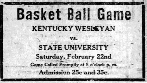 This week Wesleyan has two games scheduled for the entertainment of the people of Winchester. Tuesday night they will meet Georgetown in a battle which is expected to be faster and more exciting than the game of last Saturday night. March 1 The University of Louisville both boys' and girls' teams will visit Winchester in quest of Wesleyan scalps. As these two games are the biggest of the season and bring it to a close don't fail to cme out and support the college.