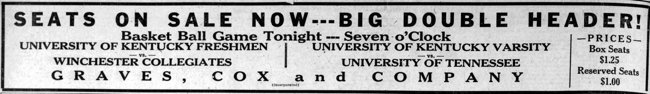Tennessee uncovered a performer who goes by the gentle name of Butcher, who lived up to his name and literally cut the Cats to pieces, especially in the first half. Kentucky, or rather Jenkins, jumped out into a four-point lead on two splendid shots by the doughty little Wildcat captain before Tennessee got a look in. Cooley, a forward, however, broke a crack in the ice with a free throw and Butcher did the rest. Four times in succession, this youngster got loose and dropped in a crip, before Kentucky knew what was going on.