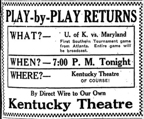 Kentucky Theatre Advertisement providing play-by-play returns from Atlanta Tournament