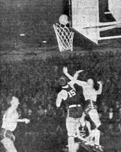 Ralph Carlisle flips a shot toward the goal while MSU's Bennie Dargush (#15) defends and UK's Tubby Thompson looks on
