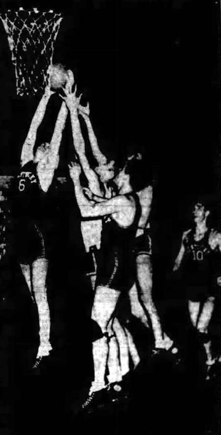 Tulane's Eugene Harmon prepares to grab the loose ball after Bobby Lockett (#13) missed a shot. Seen closest on right is Walter Hodge (#10)