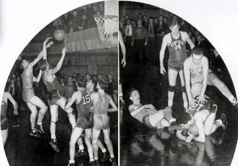 Left: Action from the game. Right: Kentucky's Joe Hagan (#14) looks on while UT's Bernie Mehen is on the floor with Bernard Opper (#12)