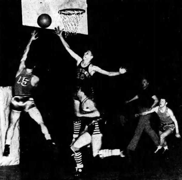 The South Benders were away for nine points before Cab Curtis, who was high scorer with 11 points, dribbled in for a crip. The Big Blue steadied at this juncture and two more two-pointers by Curtis, coupled with his free throw, one by Huber and the first of Rouse's long range baskets shot the Cats to the fore at 10-9.