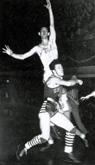 Tennessee's Gilbert Huffman soars for a left-handed shot which ties the score at 32-32 and sends the game into overtime. Also shown are Tennessee's Frank Thomas (#7), Bernard Opper (#3) and Marion Cluggish (#12)