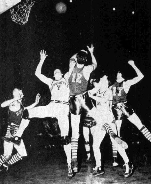 Marquette's Bill McDonald (#9) slips past UK's Marion Cluggish (#12) while Carl Combs (#17) and unidentified #24 look on
