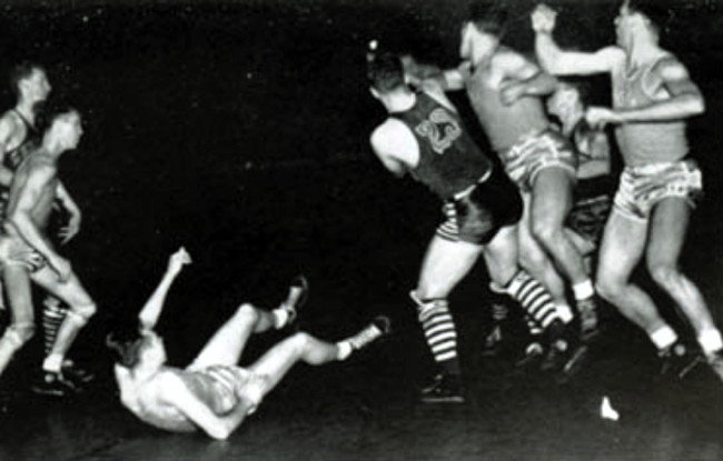 A stoppage in play as UT's Frank Thomas rushes to help up his teammate Gilbert Huffman who was fouled while UK's Keith Farnsley (#16), Marion Cluggish (#12) and Lee Huber (#11) look on as referee Dan Tehan calls in the foul.
