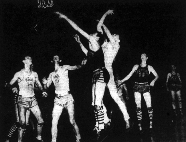 UK's Waller White and UT's Bernie Mehen jump for the ball, while UT's Frank Thomas (#14) and Gilbert Huffman (#18) (left) and Keith Farnsley (#16) and Lee Huber (right) look on