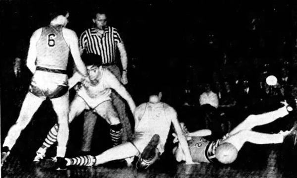 Notre Dame's Francis Quinn (#22) and Mel Brewer (#15) fall to the floor after a loose ball