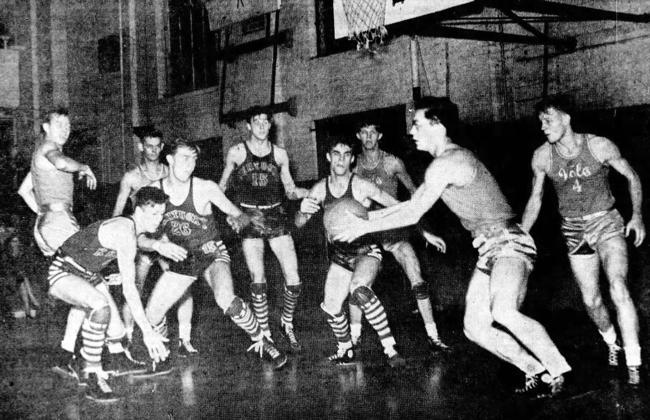 UT's Mike Balitsaris looks to set up a play as he's faced by (from left) UK's Lee Huber, Lloyd Ramsey (#26), Mel Brewer (#15) and Ermal Allen. To the right is Tennessee's Doc Clark (#4). In the background are UT's Gil Huffman and Frank Thomas.