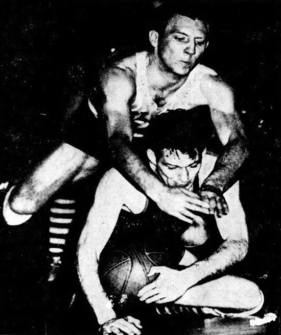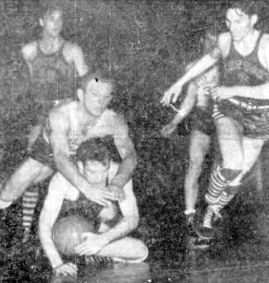 A Tulane player jumps on top of Keith Farnsley as Farnsley secures a loose ball while Lloyd Ramsey (left) and Kenneth England (right) look on