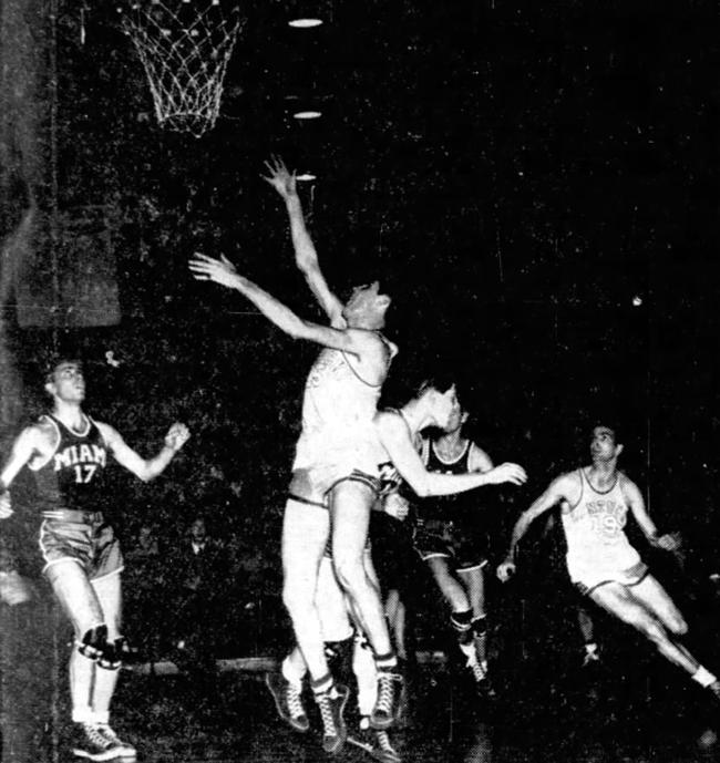 After the rest period, Miami drew first blood when Ralph Palaia tossed in a long one from near the sideline. McDade dropped through a free throw after being fouled by Staker and tipped one in to bring the Redskin total to 15 before the Wildcats could get started.