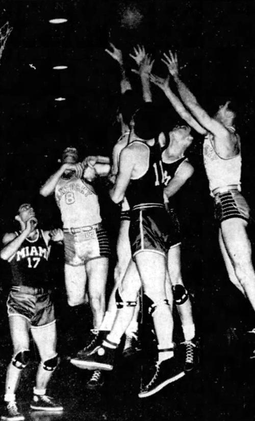 Miami was held to two field goals and two foul shots during the remaining 15 minutes of the game. McDade scored from under the basket. Palaia sank a free throw after Staker had committed his fourth personal foul and had been banished from the game. Alderman got a crip, and McDade made good a free one after being fouled by Ed Lander.