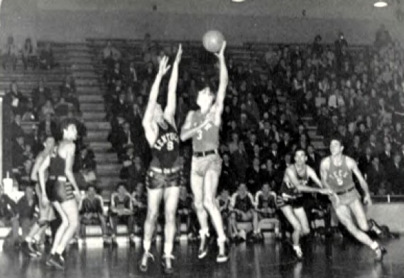 Marvin Akers (#8) misses a shot under the goal for Kentucky. Waiting for the rebound are three Yellow Jackets. From left to right: Jack Lance, William "Boneyard" Johnson (#9) and Carlton Lewis (#4)