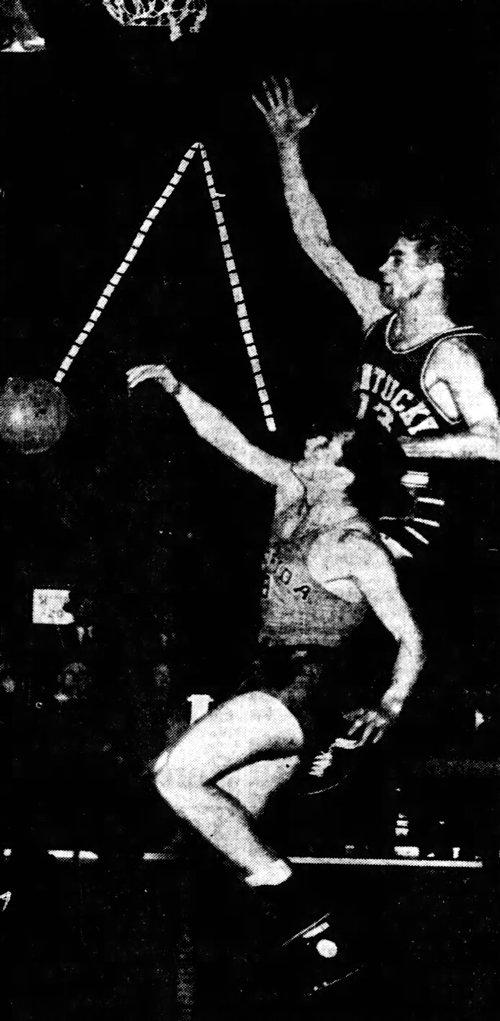 Kentucky's Jim King (#5) and Carl Staker (#16) battle Florida's Steve Ellish (#23) for a loose ball