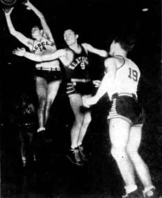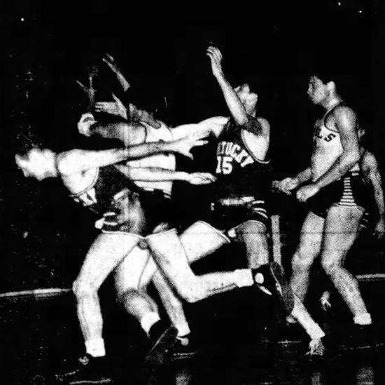 Waller White and Mel Brewer (#15) fight for the ball with Ole Miss guard Ed Hensen while Ray Poole looks on.