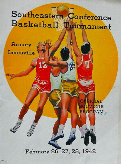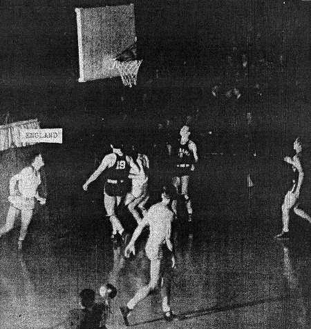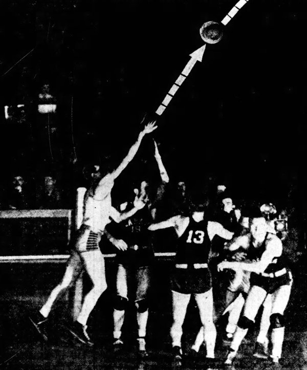 Kenneth England (left corner) looks back to see his lay-up attempt fall through the net. Seen underneath the basket are Louis Adair (#19)and James King. Facing the basket on the far side is Alabama's Bob LaPolla and watching from the foreground is UK's Waller White