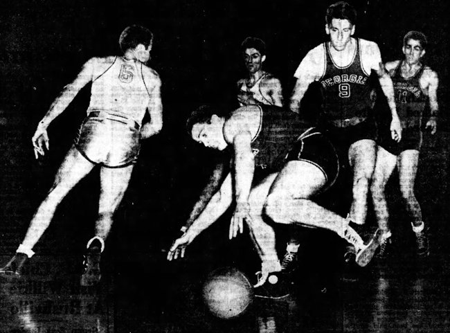 Clyde Parker (#6) has lost the ball on a pass from Bill Hamm, which leaves Georgia's Dick McPhee to grab the ball backed up by James Griffeth (#9)