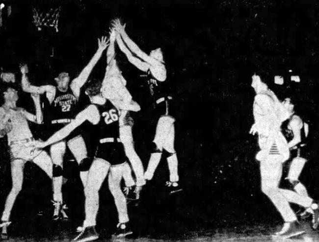 Muff Davis (center in white) tries to shoot but the ball is stolen from behind by Mississippi State's H. Reynolds (#29 in dark). Also shown from left to right include Mel Brewer (#15), MSU's Lloyd McDougal (#27) with Milt Ticco to the right