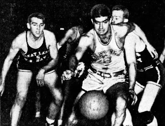 Great Lakes' Bob Davies steals the ball from Mel Brewer (#15) while from left to right, Dick Klein, Paul Noel and Milt Ticco look on