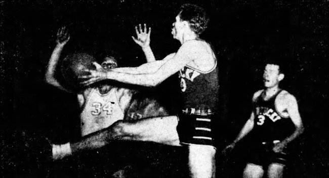 Jack Tingle attempts a circus shot in front of Shearman (#34) while Jack Parkinson looks on