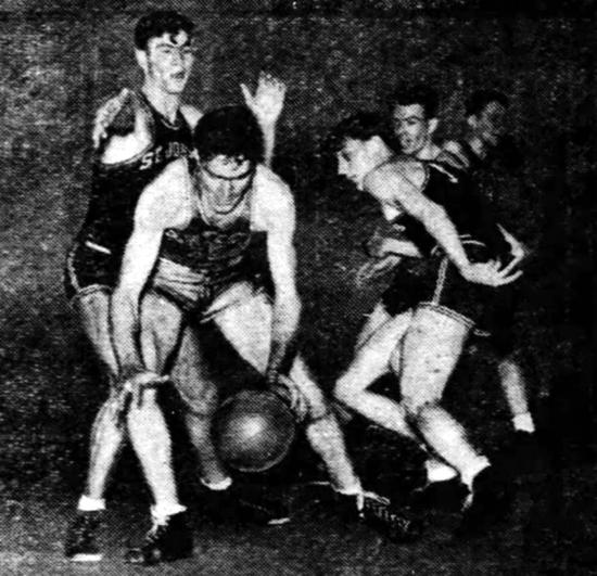 Bob Brannum tries to gain possession of the ball while guarded by St. Johns' Ivy Summer