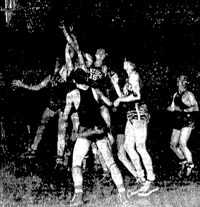 Wildcats and Bearcats fight for the ball. Shown jumping in the air for the rebound are UK players Wilbur Schu (#16) and Alex Groza (#15)