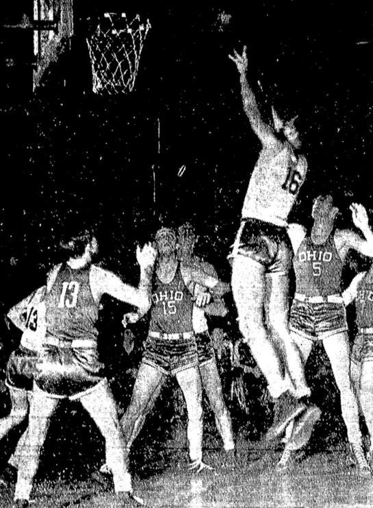 Wilbur Schu (#16) grabs a rebound while Kentucky's Buddy Parker (#13), Ohio's Jim Mackey (#15) and Bob Brandle (#5) among others look on