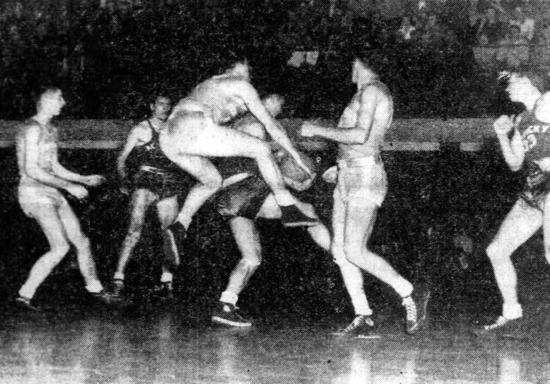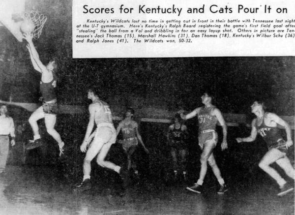 Ralph Beard scores a lay-up while trailed by Tennessee's Jack Thomas (#15), Marshall Hawkins (#31), Dan Thomas (#18) and Kentucky's Wilbur Schu (#36) and Wallace Jones (?) (#41)