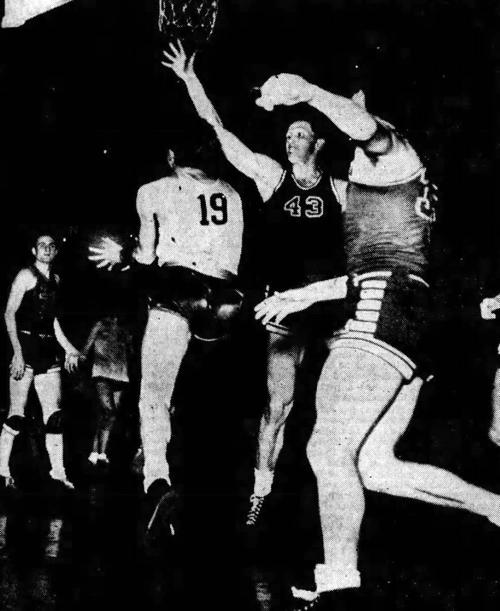 Jack Tingle (#19) drives under the basket while defended by Temple's Jack Hewson (#43) and Jerry Rullo (#35)
