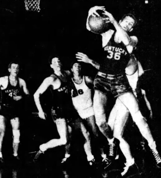 For the victorious Kentuckians, Wallace (Wawa) Jones, their freshman sensation, was high man with 16. However, much credit must go to all the winning players, the others being Jack Tingle, Jack Parkinson, Ralph Beard and Wilbur Schu. These five worked smoothly as a unit and if their exhibition of last night means anything, they will be tough to hurdle.