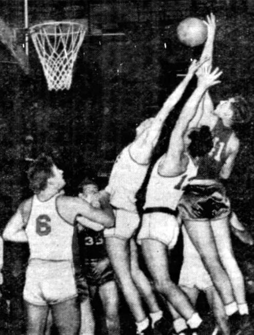 Wallace Jones (#41) skies for a rebound behind Arizona's Tim Ballantyne and Marvin Borodkin. Looking on is Arizona's Crandall ? (#6) and Jack Tingle (#35)