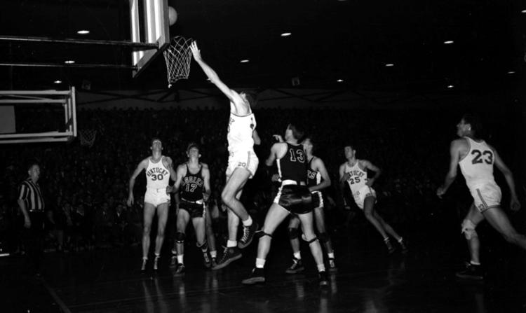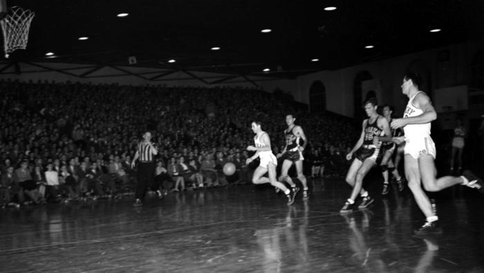 Bob Brannum scores on a hook shot