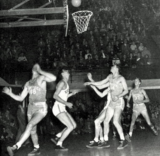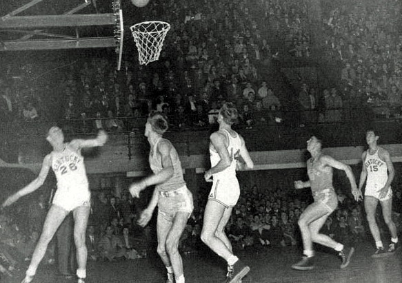 Ken Rollins (#26) and Joe Holland (#14) watch a Tennessee shot by Paul Walther (center) roll in while Alex Groza (#15) looks on