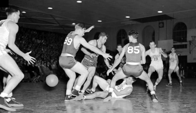 Ralph Beard pushes the ball. Facing him is a yelling Harley Griffith. Also shown are UK's Jim Line (#25) and Central's Bob Cummings (#3) and Bill McGrath (#87)