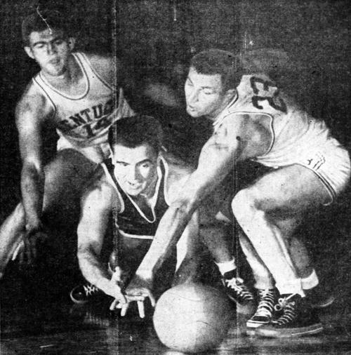 Ralph Beard jumps to grab the ball in front of DePaul's Andy Ferderinko(#11) and Chick Allen