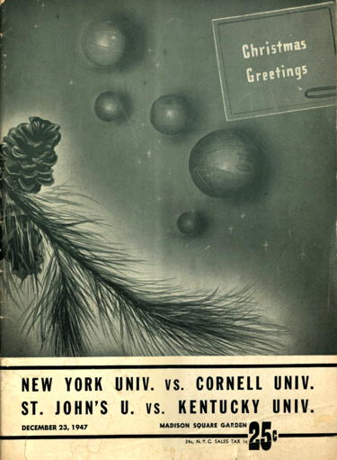 Alex Groza (#36) and Wallace Jones (#27) squeeze St. Johns' Archie Oldham (white jersey in center) for rebound. Watching are St. John's Tom Tolan (#28) and Kentucky's Jim Line (#25)