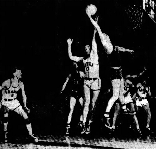 Georgia's Bob Healy shoots in front of Alex Groza while Georgia's Morton Smith (#14) and UK's Ken Rollins look on