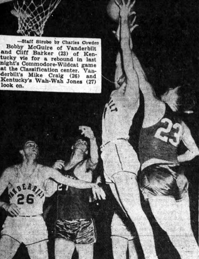 Bobby McGuire of Vanderbilt and Cliff Barker (#23) of Kentucky vie for a rebound while Vandy's Mike Craig (#26) and UK's Wallace Jones (#27) look on