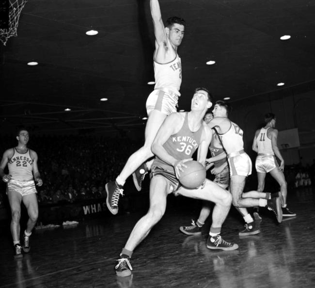 Ralph Beard soars in the air while surrounded by Tennessee players Ed Montgomery (#12), Marshall Hawkins (#22) and Art Burris (#20)