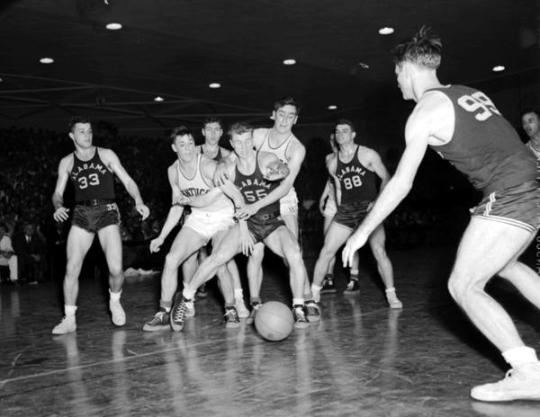 Alabama's Carl Shaeffer (#55) holds off Wallace Jones and Alex Groza (#15)